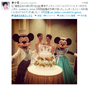 元宝塚歌劇団の男役として活躍していた東小雪さん(25)が、東京ディズニーリゾートで恋人の女性であるひろこさん(35)との結婚式を行った。この日東さんは「ご報告」と題してツイート、「2013年3月1日(金)東京ディズニーリ ゾートにてパートナーのひろこさんと同性結婚式を挙げました。ミッキー&ミニーもお祝いにかけつけてくれました!」と、挙式の喜びを伝えた。また同時に、二人ともがウェディングドレス姿と いう挙式中の写真、そしてディズニーのキャラクターとの記念撮影写真を公開している。(INTERNATIONAL BUSINESS TIMES)